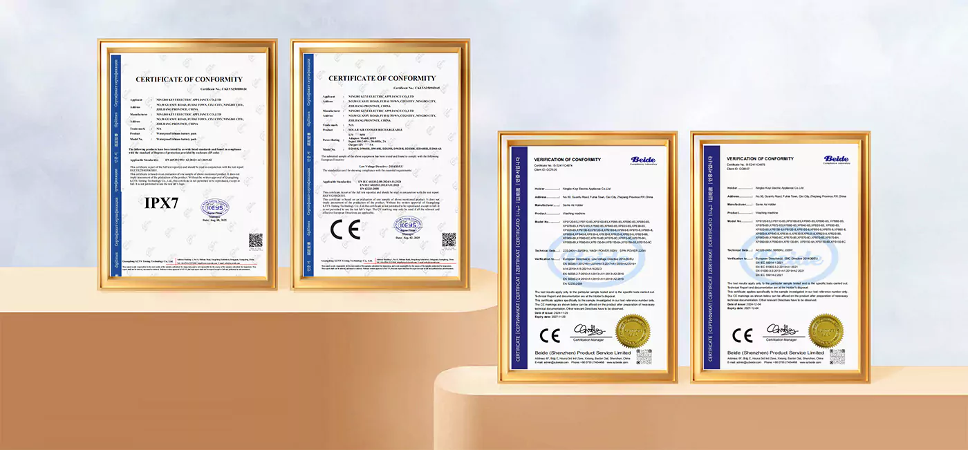 Naše pračky a vzduchové chladiče prošly testovacími normami EU a získaly certifikaci CE. Baterie se může pochlubit vodotěsností IPX7. Jsme také certifikováni jako vynikající prodejce na domácích e-commerce platformách a Alibaba.
